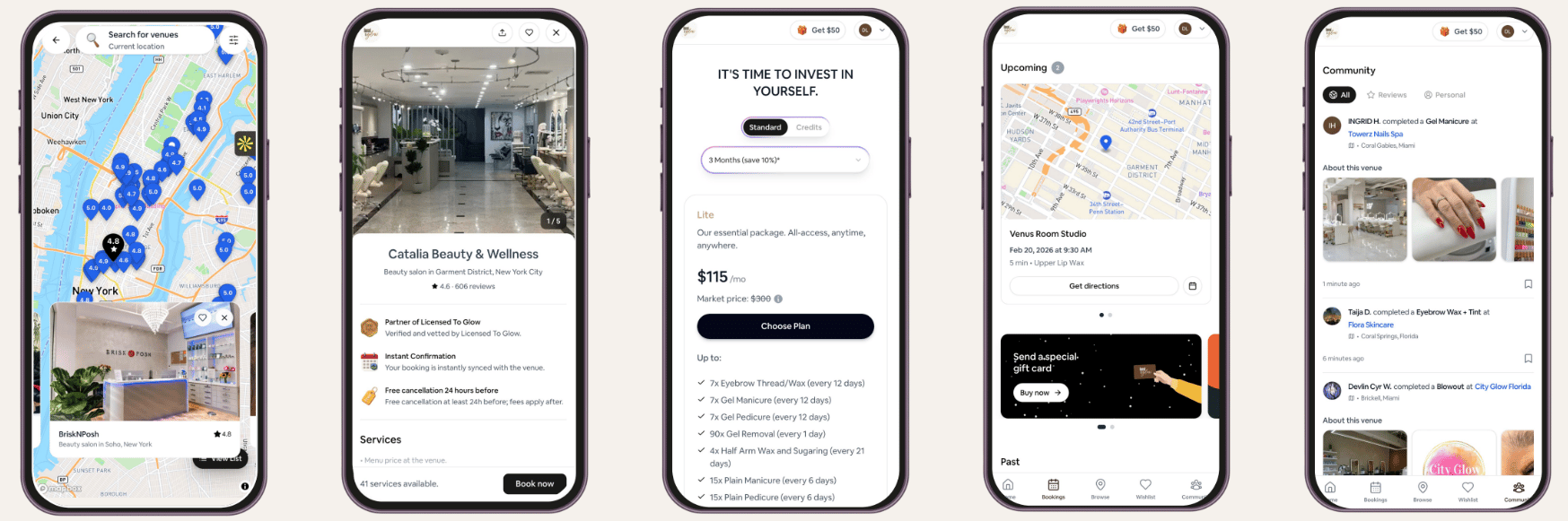 Mindbody: A consumer app allowing users to purchase appointments and memberships across thousands of wellness and beauty providers; Licensed To Glow differentiates by building an all-inclusive aggregated subscription.